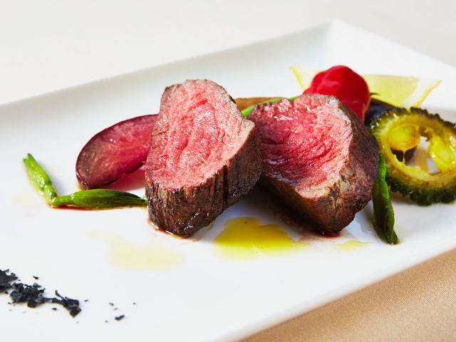 シェフのイチオシは「佐賀の和牛と本日の野菜のロースト 竹炭塩で」。佐賀から肉質の良いものだけを直送してもらっており本日はイチボだ。やわらかで味わい深く、ほんの少し竹炭塩をつけるだけで十分。肉のおいしさはもちろんだがそれに勝るとも劣らないのが野菜。シェフが野菜好きとあってそのこだわりは半端ない。顔の見える農家からの直送、無農薬、できるだけ皮付きのままで調理、もちろん沖縄野菜もとりいれる。強い甘さを感じるのは肉を焼いたときに出た油で焼くからだ。こちらも素材の良さをとことん味わえる。