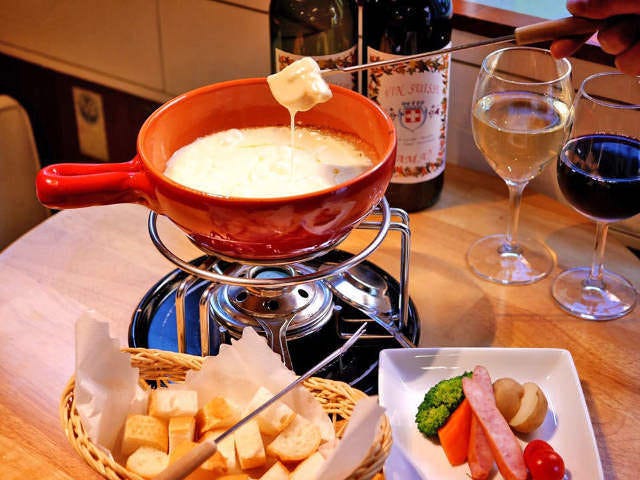 ラクレットと並ぶ定番メニューの「チーズフォンデュ」も人気。トマトやバジルなどのフレーバーつきのものもあり、王道からアクセントの効いたチーズフォンデュまで楽しめる。