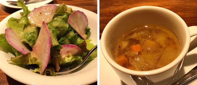 それと、サーブされる時、本来は下に玉ネギが敷いてあって、ソースも醤油と玉ネギベースなんだけど、「玉ネギ抜き」でお願いしたら大根おろし&醤油ベースのソースをわざわざ作ってくれたんです!