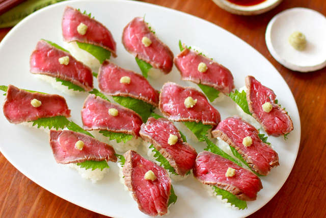 【アレンジ②】上品な見た目がお招きにぴったり! 青じそ香る「ローストビーフ寿司」