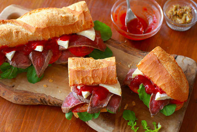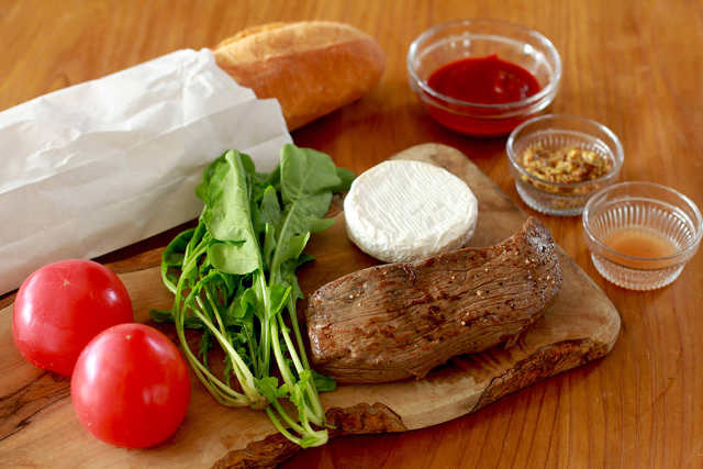 ② バゲットに粒マスタードを塗り、ルッコラ→ローストビーフ→トマト→ローストビーフ→カマンベールチーズの順に具材を挟んで、Aを合わせたソースをかける。