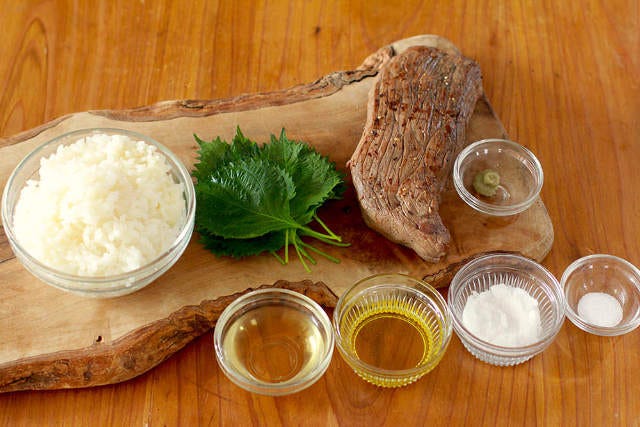 ② ①のごはんに青じそ、ローストビーフをのせ、上からオリーブオイルを塗ってわさびをのせる。醤油をつけて食べる。