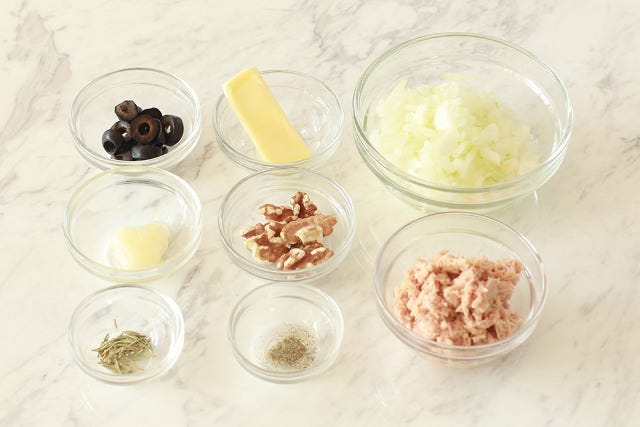 ② ①に荒く砕いたクルミを混ぜ、ドライローズマリーを散らす。