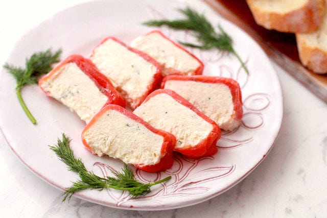 フレンチの定番「テリーヌ」も缶詰を使ってお手軽に。鮮やかなピンク色のスモークサーモンとカニ缶を使うことで、見た目も華やかで美しい仕上がりになる。事前に作って冷やしておけば、おもてなしの前菜としてさっと出すことができてとっても便利。バゲットやクラッカーなどにあわせて食べるのがおすすめ。