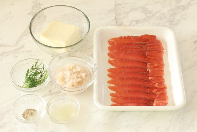 ① カニ缶はほぐしてクリームチーズ、レモン汁、ディルとよく混ぜ合わせる。