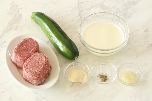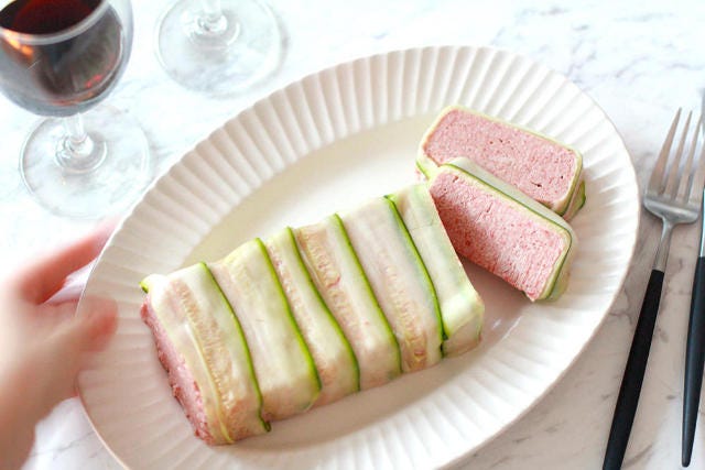 ④ ラップを敷いたパウンドケーキ型(縦16cm×横8cm×高さ5cm)にズッキーニをしき、①に粉ゼラチンと②を加え混ぜ合わせた生地を流し入れ、冷蔵庫で3〜4時間冷やし固める。