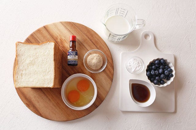 ③ 器となる食パンに②を卵液ごと戻し入れ、ブルーベリーを乗せたら180℃のオーブンで30分ほど焼く。