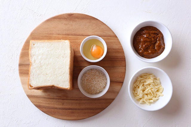 食パンをまるごと使った、インパクトもボリュームも満点のカレーパンアレンジ。オーブンで焼くことでこんがりサクサクになったパン粉が、カレーパン特有の揚げ衣を彷彿とさせる。 カレーの中にはとろ〜り卵とチーズが隠れているので、カレーと混ぜながら食べると美味。