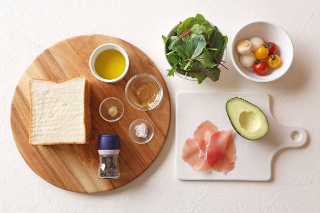 ② マッシュルームは薄切り、生ハム、アボカドはひとくち大、ミニトマトは半分に切る。