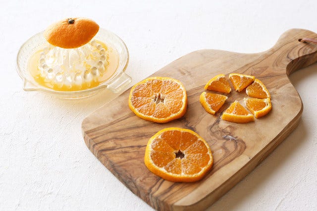 ① ミカンをよく洗い、5mm程度の輪切りを3枚作り、さらにそれを6等分にカットする。残りのミカンは絞る。