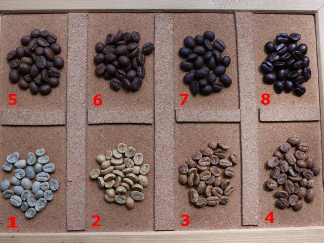 下段の1~4は、すべて豆がハゼる(芯まで火が通り、豆が膨らんで開くこと)前の状態。ゆっくりと色が変化していく様子がわかる。この段階では酸味やえぐみが強く、飲むのには適さない。
