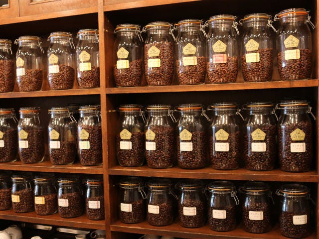 店内はヨハン・セバスチャン・バッハなどのクラシック音楽が流れ、カウンターの棚にはガラスのキャニスターに入ったコーヒー豆がずらりと並ぶ。
