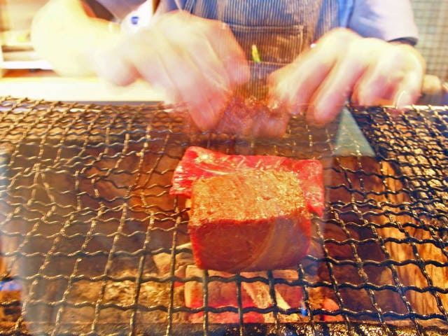 注文を受けたスタッフは、トングと、時には素手でもって、備長炭の火があかあかと灯る網上の肉をこまめに移動させていく。牛の部位によって火の入り方が異なるため、肉の塊一つ一つと丁寧に対話しながら、じっくりと焼き上げていく必要があるのだという。