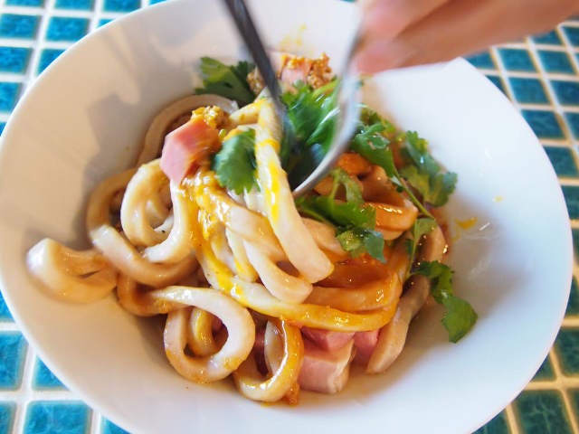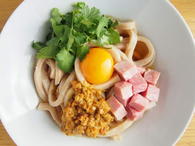 「こちらはよく混ぜて召し上がって下さい」と、スタッフが卵黄とパクチー、自家製ハム、キーマカレーをその場で混ぜてくれる。混然一体となったソースと弾力ある伊勢うどんは絡みもばっちり。コリアンダーやターメリック、チリ、ガラムマサラなどのスパイスが香るキーマカレーは深い味わいで、コクのある濃厚なカレーうどんとなっている。うん、大満足だ!
