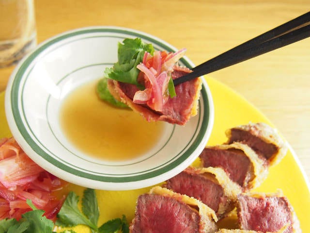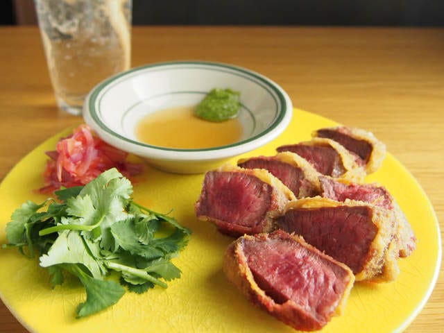 斬新なマッチングがユニークなメニューをもう一品。それが「和牛ハツのレアーカツ」(写真・上)だ。こちらはフレッシュな黒毛和牛のハツを使った揚げ物。絶妙な火入れを施すことにより、ぷりんぷりんとしたハツ特有の歯ごたえが楽しめる。パクチーと共に付け合わせとして添えられているのは、赤タマネギの自家製「アチャール」。水にさらしたタマネギとピーマンを、ショウガ、塩、レモン汁で味付けしたインド風のすっぱいお漬物だ。