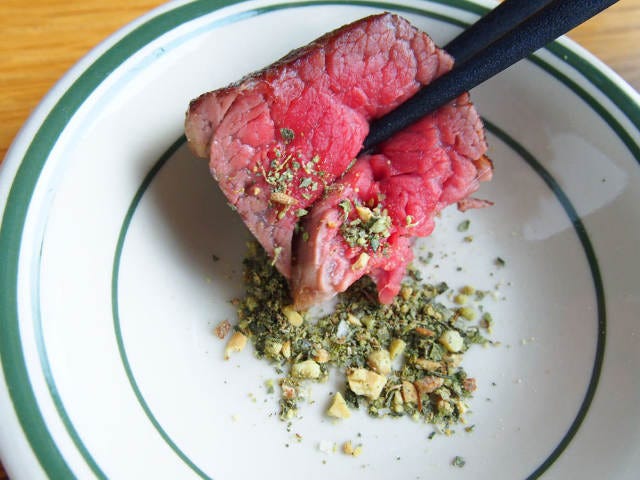 ステーキは、肉そのものの味わいを堪能できるよう、塩のみのシンプルな味付け。そこに、スパイス塩やハーブ塩、イギリス王室御用達の海塩「マルドン」が添えられ、好みの味付けで食べるスタイルになっている。もともと消化に負担のかかりにくい赤身肉が中心であるのに加え、たっぷりの野菜、ハーブやスパイスと食べることで、胃もたれせずに、ヘルシーにステーキを楽しめる。