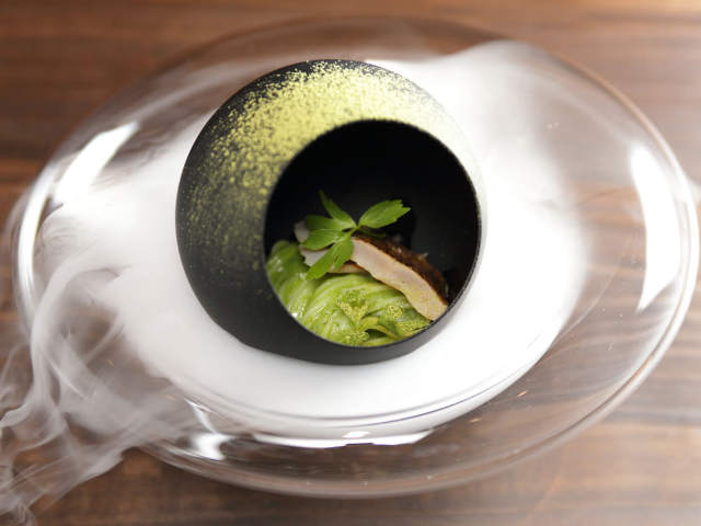その見た目に驚きつつ、ひと口味わうと、まずパスタに乗った緑茶とフェンネルのグラニテ、そしてトウキと大和茶の粉末が相まった“緑”の香りが鼻に抜ける。よく脂が乗ったアマゴと滋味深い大和真菜のソースは、塩さえ最小限に抑えられ、素材そのものの味わいが際立つ。パスタはツルリとのど越しがいいが、それさえアマゴや大和真菜の風味を引き立てる名脇役。ゲストは料理を味わうことで、自分の記憶の中にある「霧の森」の思い出、風景が呼び覚まされ、それも一緒に味わうこととなるのだ。
