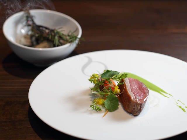 この日のメインは「鴨と柿 ローズマリーの森」(写真上)。さっとグリルしてうまみを凝縮させた奈良の葛城合鴨に、辛子のような香りのハーブ・ナスタチウムのソースと、奈良漬けの酒粕と干し柿を合わせた味噌が添えられている。さらに、提供時には燻され煙の上がるローズマリーも登場し、森の新緑のような香りが立ちこめる。干し柿の甘みが奈良漬けの発酵味に奥行きを与える味噌は、鴨から溢れ出す上品な肉汁と調和。ナスタチウムの辛味もアクセントとなり、鴨のうまみを強調する。