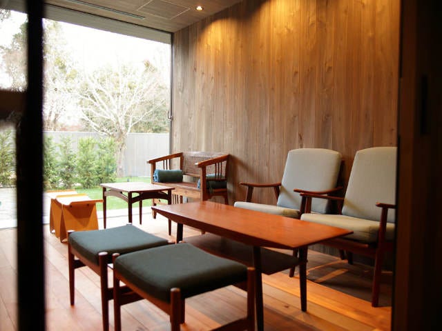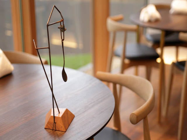 欧州の老舗ビストロを想わせるポーチと、真っ青なドアを開くと、東大寺に隣接する北側一面をガラス張りにした、モダンですっきりとした空間が広がる。どこか凛とした佇まいの桐天井、木目と焼きのニュアンスが美しい床、フォルムの美と座り心地を追求した北欧のハンスウェグナーの椅子など、そこかしこに柔らかな木の存在感が漂っている。