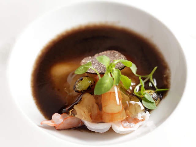 写真上の料理、「湿った蕎麦 半生のエビとトリュフ風味」もまた然り。奈良・桜井にある手打ち蕎麦店の粉を使って、そばがきのように仕上げ、半生に茹でたエビと黒トリュフを合わせたものだ。イメージしたのは庭の「結界」の外の土。半生のエビのねっとりとした食感や、蕎麦とエビを合わせたピューレのような色合いと弾力、そしてどこか土のような香り。さらに、そばがきのもっちり感、ぬるい温度も相まって、雨の後の土がぬかるんだ風景を喚起する。あのいい意味での土臭さと、足元の感触……ふと、小学校から帰る、雨あがりの日の記憶が呼び覚まされる。
