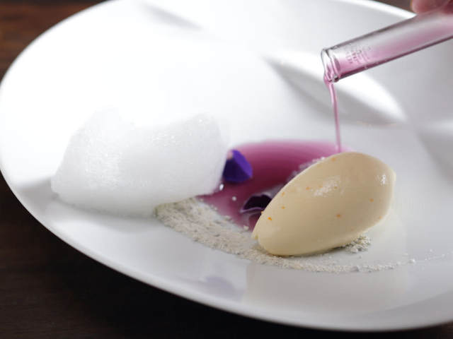 デザートは「水面の月 すみれの海」(写真上)。このメニューは、川島シェフが以前雨の竹林を訪れた際に、足下一面に広がっていたスミレの葉からインスパイアされたもの。「もしスミレの花が開花したら、海のように見えるのでは?」と自身が感じた想いを投影している。ハッサクのジェラートは月。スミレとハイビスカス、レモングラスを合わせたソースは海。そしてハッサクのエスプーマは雲。夜の海にかかる半月の風景が瞼に浮かぶ。味わうと、スミレのあでやかな香りと風味、そしてハッサクの酸味と苦味のマリアージュが楽しい。この「記憶をたどる食卓」の終焉にぴったりで、口内を爽やかに、そして幸福に演出してくれた。
