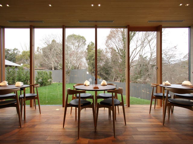 一方、窓の向こうには芝生の庭園が広がり、それを囲う板塀(店では「結界」と呼ばれている)の向こうには東大寺の森。自然と一体になって深呼吸したくなるような、それでいて背筋を正さねばならぬような、不思議な気持ちにさせてくれる場所だ。