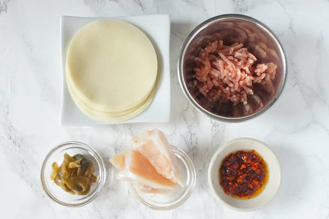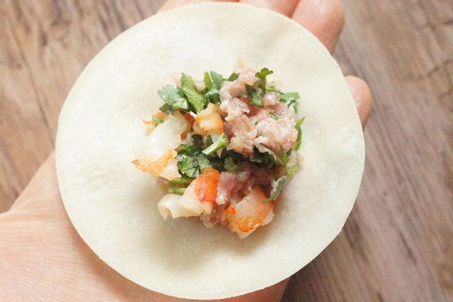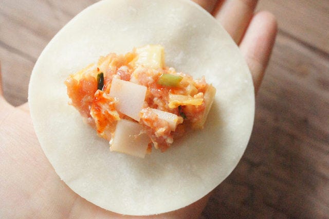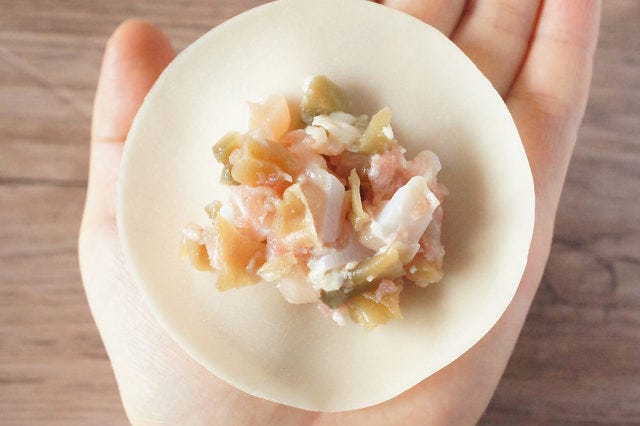 ③ 餃子の皮の真ん中に②をのせ、水溶き片栗粉(分量外)を淵につけて成形する。