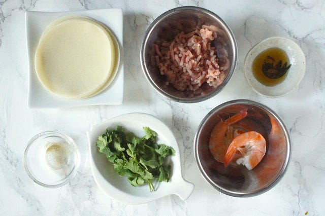 ① ボイルしたエビは粗みじん切りにする。パクチーは茎を除いて細かく刻む。