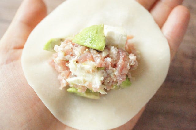③ 餃子の皮の真ん中に②と①、とろけるチーズを適量のせ、水溶き片栗粉(分量外)を淵につけて成形する。