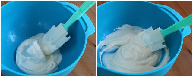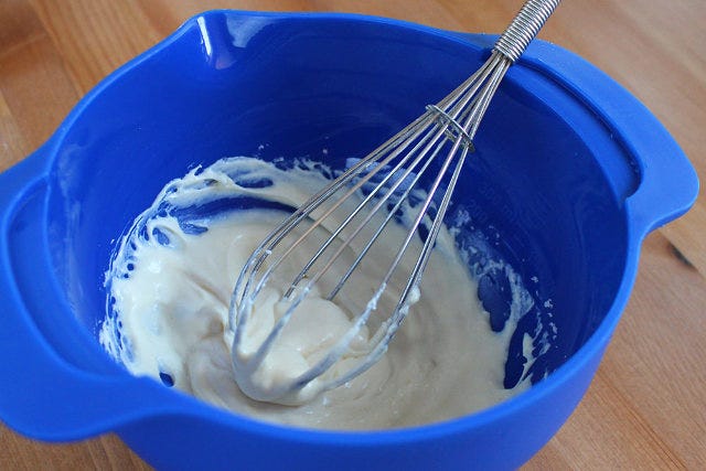 ③ ボウルにクリームチーズと水切りしたヨーグルト、練乳を入れ泡立て器でなめらかになるまでよく混ぜる。