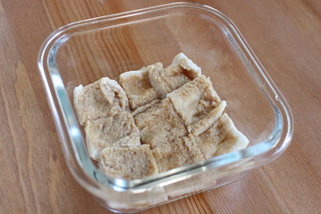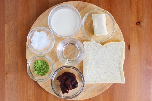 ③ 耳を取り除いた食パンを16等分にし、まず約半分を器に敷き詰め、抹茶液の半量をかけ、粒あんの半量を均等に乗せ、②の半量を流し入れる。