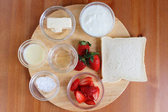 ④ 耳を取り除いた食パンを16等分にし、器に約半分を敷き詰め、スライスしたイチゴの1/2を並べ、①のイチゴソースの1/2をかけ、③の半量を流し込む。この工程をもう一度繰り返す。(お好みで余ったイチゴソースとイチゴを飾り、粉糖をまぶす)