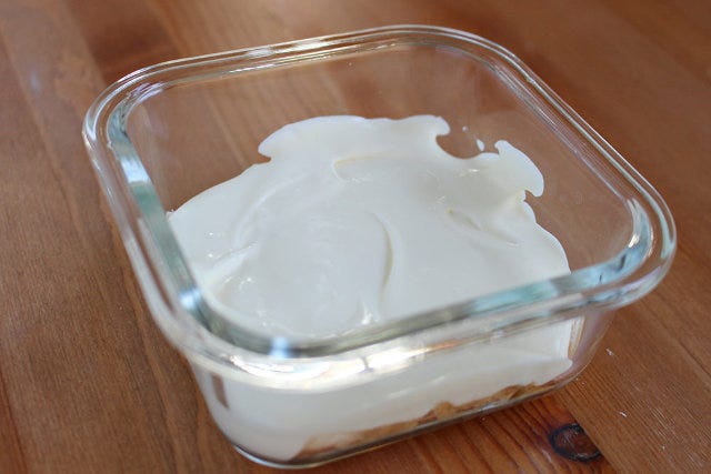 ② ヨーグルトはキッチンペーパーに包み、水切りしておく(100gが約50gになるくらいが目安)。クリームチーズは室温に戻し柔らかくしておく。