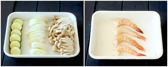 ① ズッキーニは厚さ1cmの輪切りにする。長ネギは斜め切りする。シメジは石づきを切り落とす。殻付きエビは背わたを取り、尾を残して殻をむく。