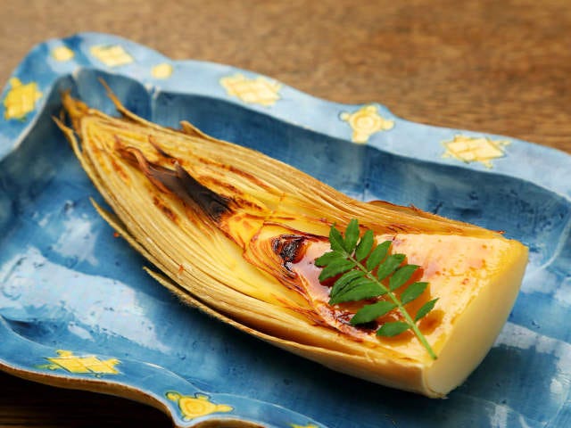 こちらは焼き物で、醤油の芳ばしさがやんわり香る「京タケノコの醤油焼き」(写真上)。甘くてみずみずしい京都・塚原産のタケノコにはうまみがギュッと詰まっている。先付けも焼き物も京野菜を使った料理が多いのが特徴だ。