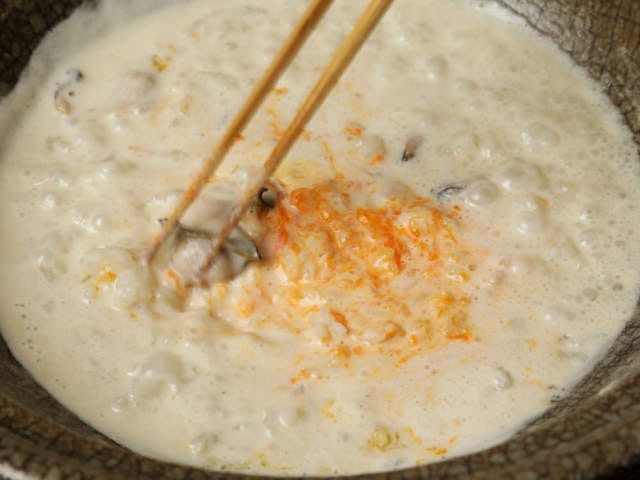 そして次は、煮切った鍋のシャンパンにクリームを注ぎ、沸騰したら再び貝を入れる。ミルキーな甘い香りに癒されながら見守ること数分。素材のうまみを優しく包み込むように、和から洋へと瞬く間に変身する(写真下)。