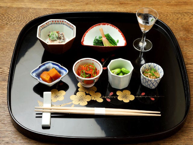 ポンッとシャンパーニュを抜く前に、まずは毎日6品~8品ほど用意される先付け(写真上)から。ラインアップは干し椎茸のだしがきいた「菜の花と京人参、キクラゲの白和え」、赤い根と糖度の高さが特徴的な山形県の伝統野菜「赤根ホウレンソウのお浸し」。シンプルに茹でられた「ソラマメ」、上品な味わいの「京人参と万願寺唐辛子のきんぴら」、ピリ辛にアレンジされた「自家製カラスミ」、そして「じゃこと万願寺唐辛子」だ。これだけ豊富に肴があると呑ん兵衛は嬉しくなる。