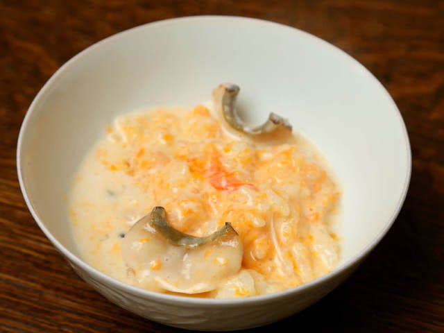 これで〆のアワビリゾットが完成だ(写真上)。太陽のように鮮やかな卵黄は、大分県の「蘭王たまご」。カニの殻や海藻粉末、ビール酵母、乳酸菌など、ミネラルが豊富な飼料で育てられた卵黄を使用するのもこだわりの証拠。柔らかいアワビと卵が絡み合うと濃厚さがより増す。リゾットにすることで、一滴も無駄にすることなく良質な食材のうまみを蓄えたスープを堪能できる。