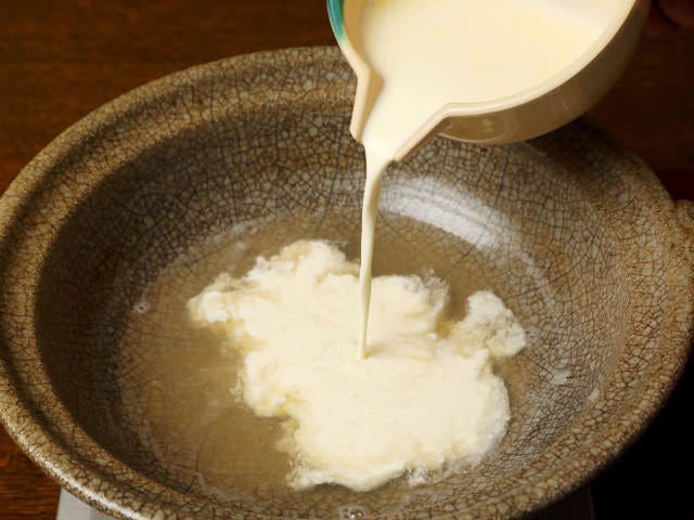 「隠し味に白味噌を加えることで、チーズのようなコクがでるんです」と力石さん。ここでスッとフランスパンが供される。とろみがついたクリームと一緒に食べるというプレゼンだ。