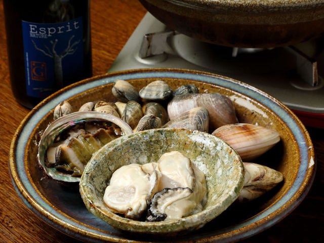 では、『美登里』の看板メニューである「シャンパン鍋」を紹介しよう。まずカラカラと擦れる音に合わせて、皿にたっぷり盛られた貝類が登場(写真上)。季節によって産地や種類は変わるが、この日は宮城県産のアワビや岩手県産のカキ、千葉県産のハマグリ、熊本県産のアサリなど立派な貝たちのお目見えだ。これらの貝をシャンパーニュとともに煮込んでいくが、鍋に使用するシャンパーニュは、主に5種から選択することができる。(写真下)
