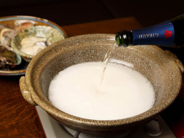 作り方は、まず土鍋に惜しげもなくシャンパンを注ぐ(写真上)。シュワっときめ細やかな泡が立ち、パチパチと可憐な音色が鍋中に響く。ボトルの半分ほどまで注ぎ、香りづけにエシャロットを加えてコンロを点火。さっきまで店中に漂っていただしの香りが、シャンパーニュの妖艶な香りへと変化する。そして、ひと煮立ちしたところで貝を投入。この順番を間違えると貝の生臭さが出てしまうそうだ。