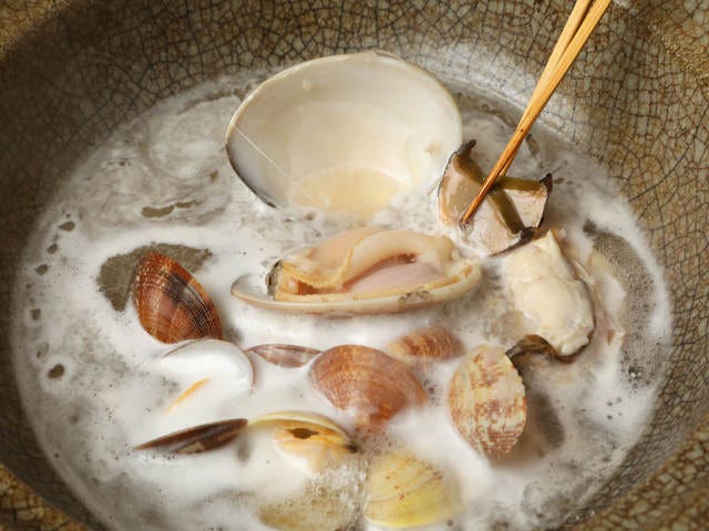 待つこと数分。全ての貝が開いたら、まずはこのままシャンパーニュと貝だけを味わってみる。海のミネラルとブドウが育ってきた土壌のミネラルが見事にマリアージュし、うまみがたっぷり凝縮されたシンプルなスープに心奪われる。