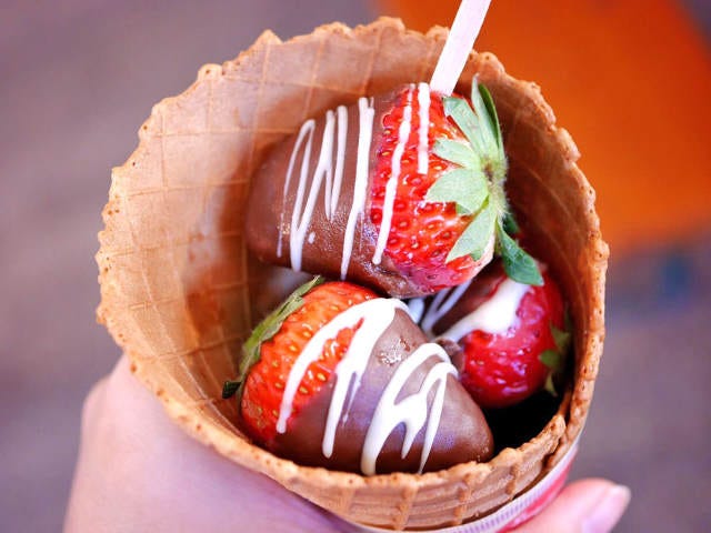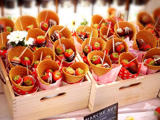 おすすめは『アッシュ×エム』の「伊豆の国紅ほっぺのチョコディップ」。シュガーコーンの中にチョコレートコーティングされたいちごがどっさり入った、いちごとチョコレートを存分に味わえる一品。