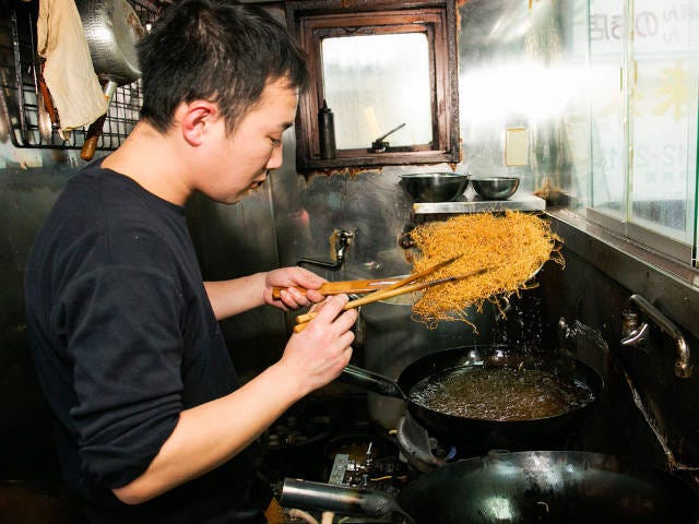作ってくれるのは、店主の息子さんであり2代目の芳雄さん。まずは麺を油で揚げて…
