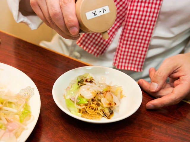 ちなみに、皿うどんというと、練りからしや酢醤油をかける方が多いですが、本場はみんな「ウスターソース」をかけて食べるのだ! 醤油ベースの餡にウスターの酸味とスパイシーさが加わって、より香りが立ちます。和風×洋風×中華、これぞ異国情緒漂う長崎の味!