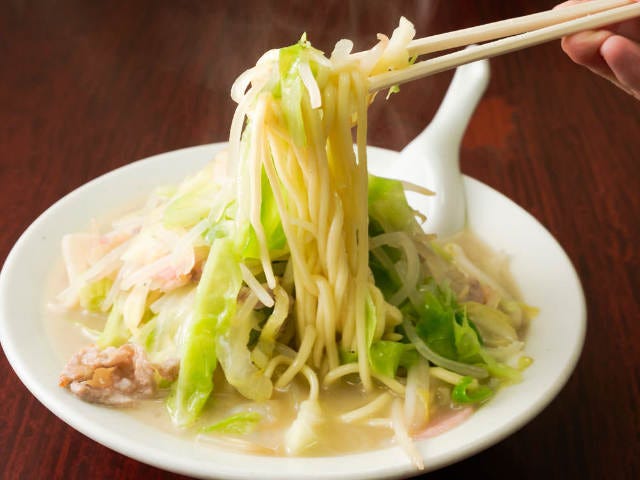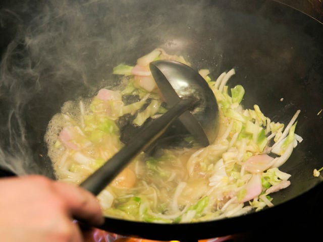 まずはスープから…、これは、す、凄い!! 口の中で、モヤシ・キャベツ・タマネギ・エビ・イカ・豚肉、そして“はんぺん”(長崎では、かまぼこのことを、“はんぺん”と呼びます)が持つ、それぞれの具材から染み出たうまみが合わさって、複雑かつ完璧な形で、味のハーモニーを奏でてる! 具材を強火でサッと炒め、そこにスープを加えることで、うまみが引き出されるそうです。そしてそのスープをくぐった具材と麺を頂いてみましょう。