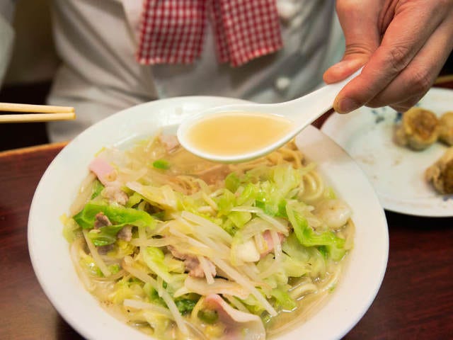 それにしても、長崎ちゃんぽんのお店なのに、餃子のレベルがあまりにも高い! 思わず「原田さん、餃子専門店を出して欲しいほどのウマさですよっ!」と伝えたら、「いや、考えたことあるんだけどね、あんまり商売っ気出したらいけないかなって(笑)」と、お茶目なノリで返答! それほど餃子がおいしいのに、あくまで看板の長崎ちゃんぽんにこだわる地道さが本場・長崎の味を守ることができている秘訣と見た! この餃子を上回る自信、そして看板メニュー、長崎ちゃんぽん。いよいよ真打の入場です!
