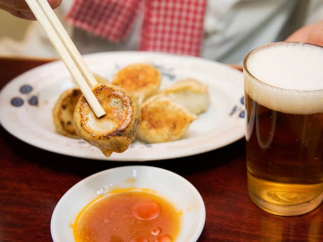 焼き面カリッ、そして少し厚めの皮を噛むと、うまみたっぷりの餡のお出ましです! こりゃビールと合うなぁー。餡の材料は、タマネギとニラと豚肉。タマネギの持つ甘みと豚肉のうまみが、小さな宇宙(餃子)にギュッと詰まっています。店主の原田さんいわく「この味を出すにはね、挽き肉をよーく捏ねること!」なんだそう。餡がきめ細やかになり、甘みが増すとのことです! 素材が同じでも捏ね方ひとつで味が変わる。やはり、料理は科学です。