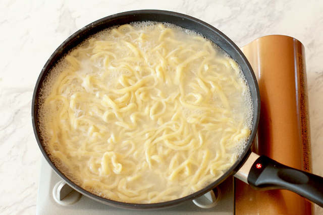 ④ ①の生パスタと茹で汁を③に加えて、塩コショウで味を調える。