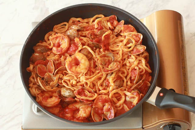 ⑩ アサリとエビを戻し入れ、パスタも加えて混ぜたら塩コショウで味を調える。